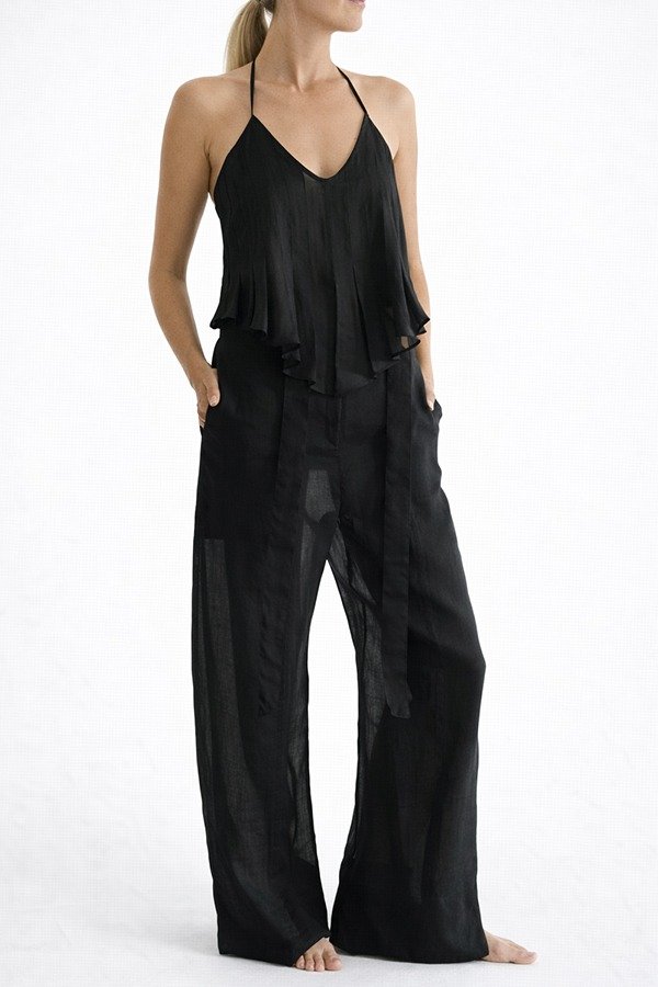 El Top Caracol se encuentra realizado en 100% ramio. Tiene escote en V regulable, que se ata en cuello con tiras bien finas, con una pieza de nácar como terminación. Detalle de tablas verticales en el frente que sueltan en cintura para dar más movimiento al top. Tiene un tajo en el centro y terminación simétrica en pico. La espalda es abierta en V con ruedo recto.