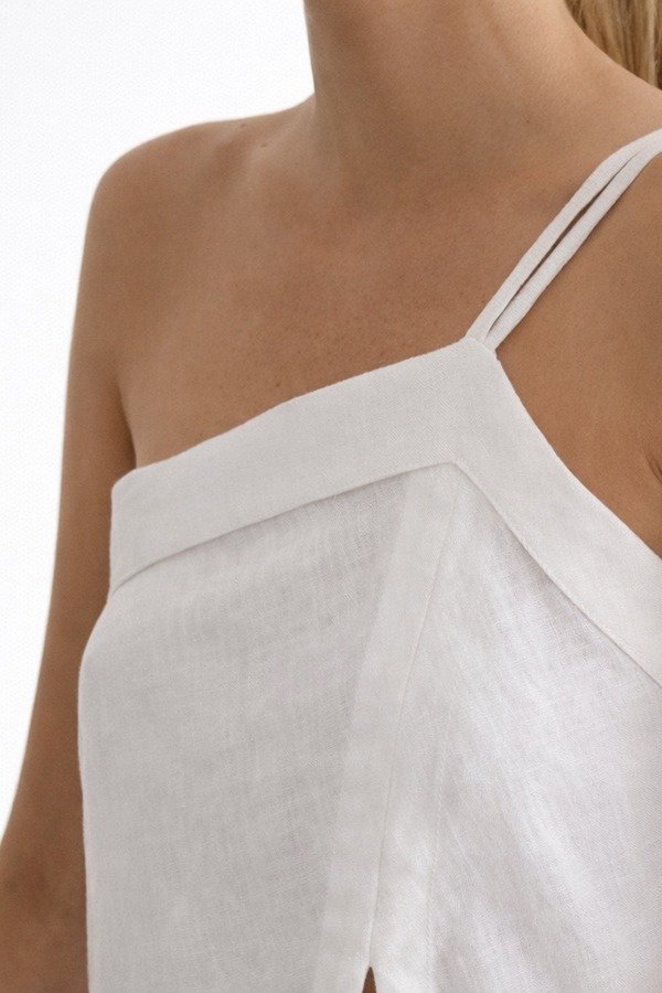 El Top Mansa está realizado en 100% lino. Es un top asimétrico de un solo hombro con dos tiras bien finas y recortes en frente y espalda para un mejor calce. Terminación en pico en el lateral derecho y tajo en el frente.