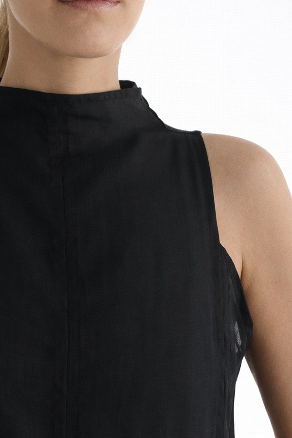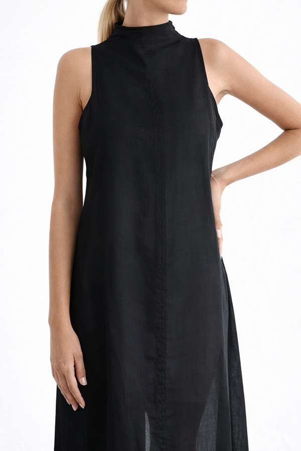 El Vestido Esteño se encuentra confeccionado en 100% ramio. Con escote cerrado que sube hasta el cuello, sin mangas. Con recortes en el frente para lograr un mejor calce en busto, y generar una silueta recta y relajada. La espalda tiene detalle de abertura que se cierra con botones de nácar, y un tajo inferior con terminación en picos. El largo es al tobillo.
