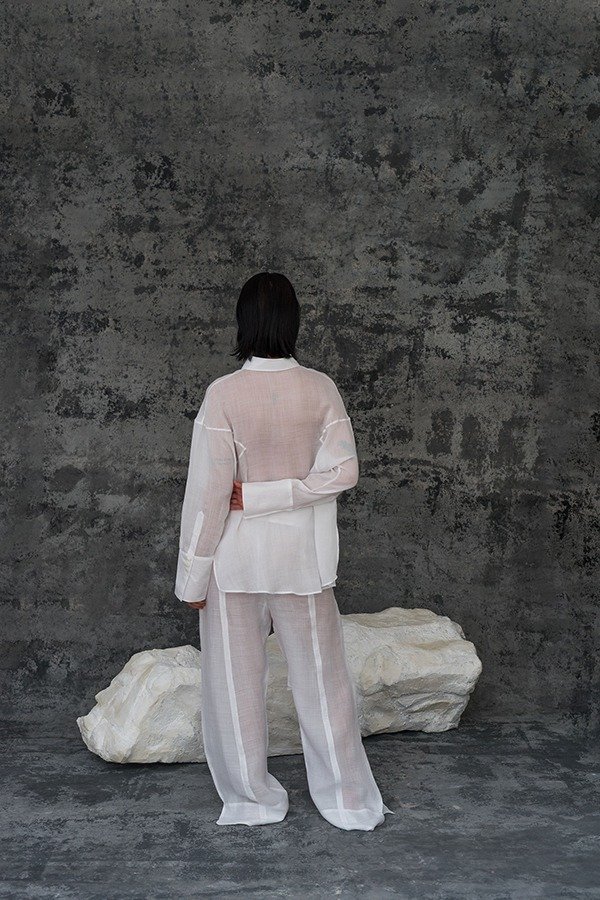 El Pantalón Bruma se encuentra confeccionado en 100% ramio. Es un pantalón de calce recto con recortes verticales en frente y espalda. El acceso es con cierre y dos botones en 100% nácar. Tiene detalle de lazo en cintura para regular el calce, y tajos en laterales de botamanga.