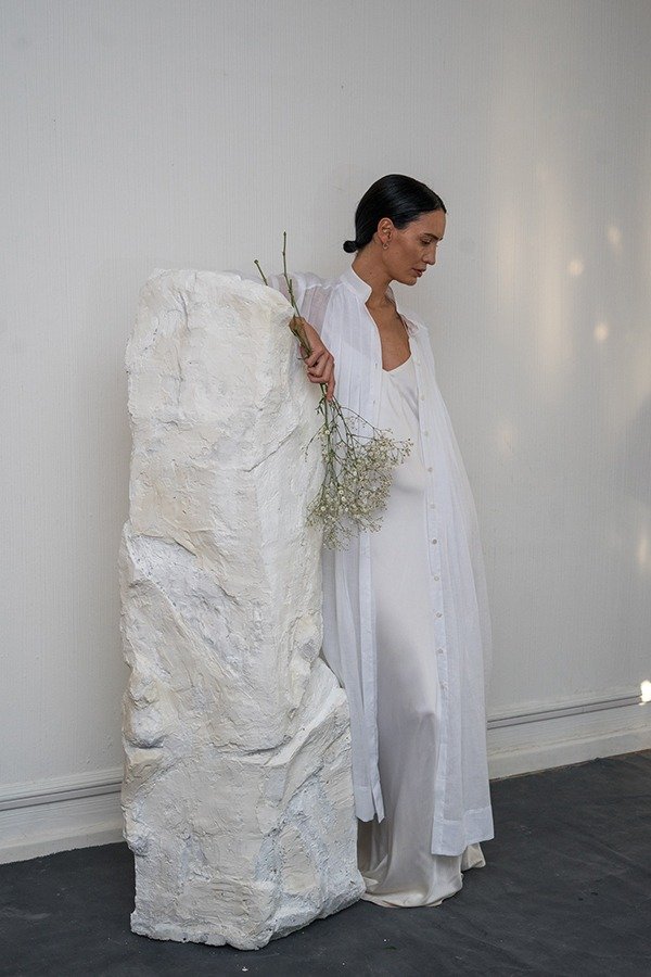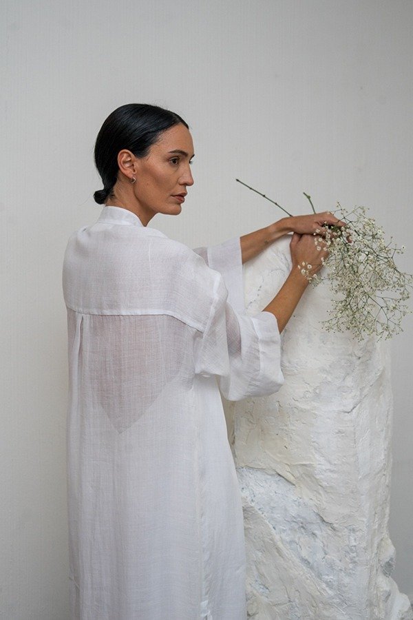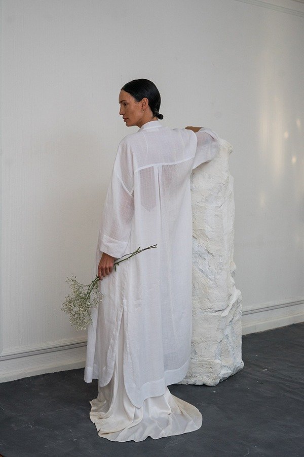 La Camisa Bruma está confeccionada en 100% ramio. Larga al tobillo, de calce holgado, con cuello mao, tajos en laterales, y manga amplia de tres cuartos. Detalle de tablas verticales en el frente que sueltan en cintura para dar más movimiento a la camisa.