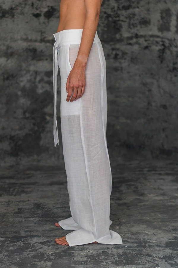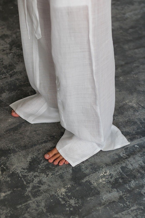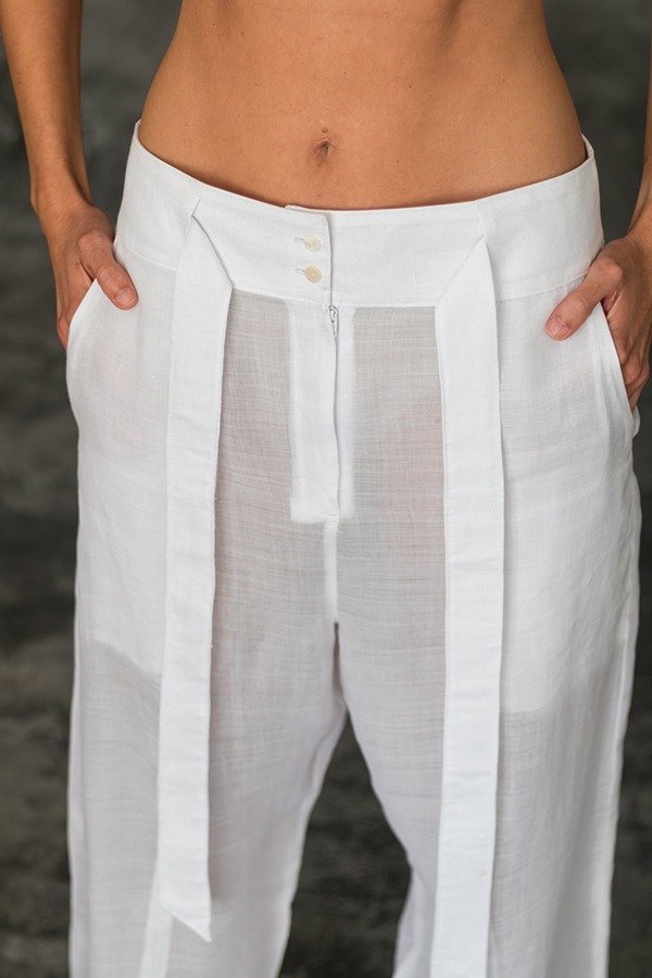 El Pantalón Bruma se encuentra confeccionado en 100% ramio. Es un pantalón de calce recto con recortes verticales en frente y espalda. El acceso es con cierre y dos botones en 100% nácar. Tiene detalle de lazo en cintura para regular el calce, y tajos en laterales de botamanga.