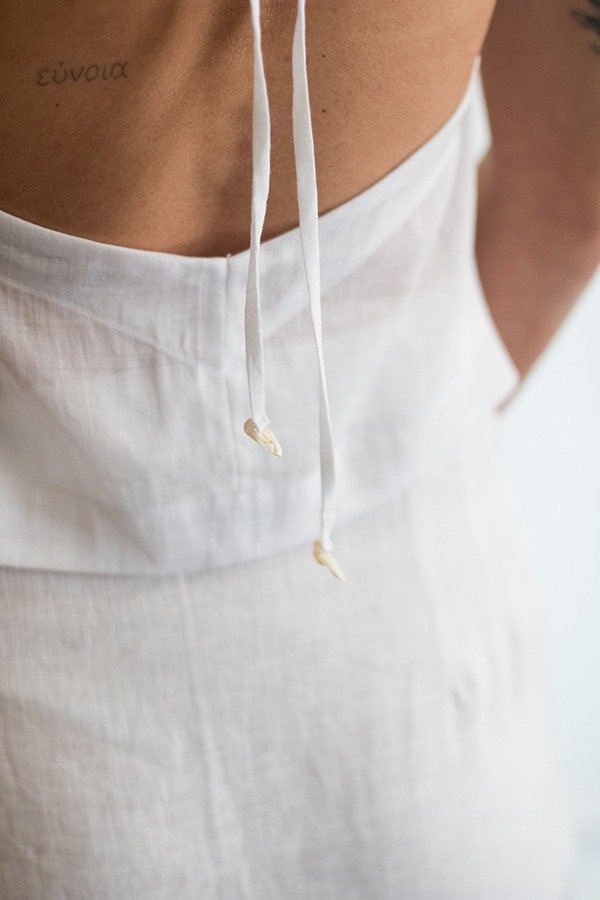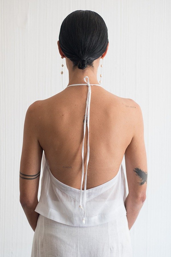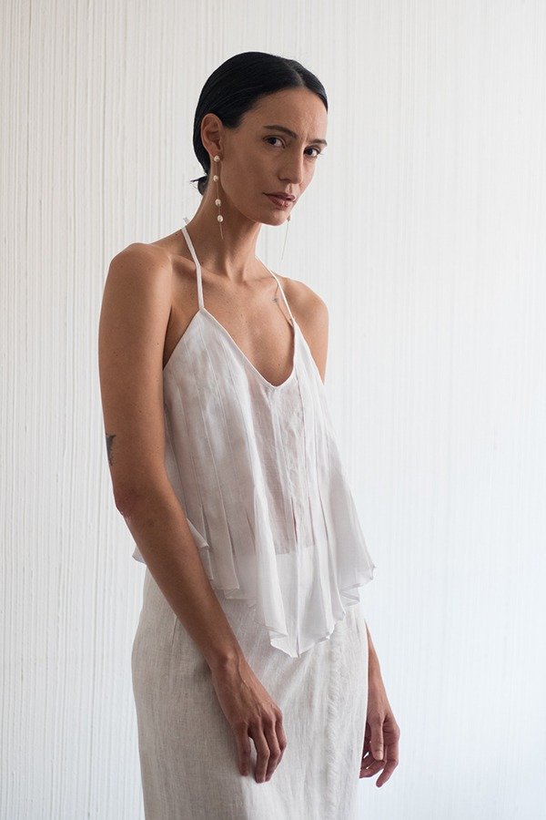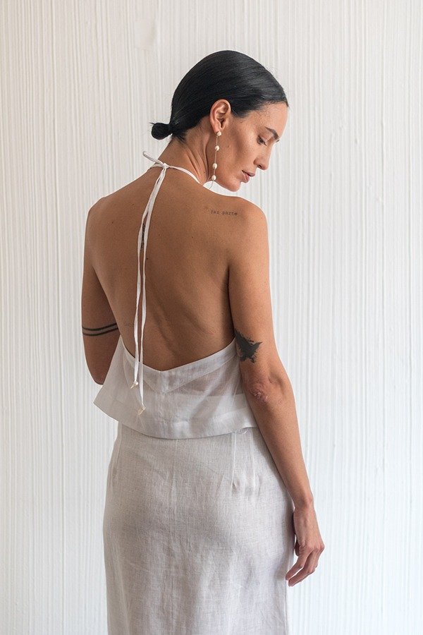 El Top Caracol se encuentra realizado en 100% ramio. Tiene escote en V regulable, que se ata en cuello con tiras bien finas, con una pieza de nácar como terminación. Detalle de tablas verticales en el frente que sueltan en cintura para dar más movimiento al top. Tiene un tajo en el centro y terminación simétrica en pico. La espalda es abierta en V con ruedo recto.