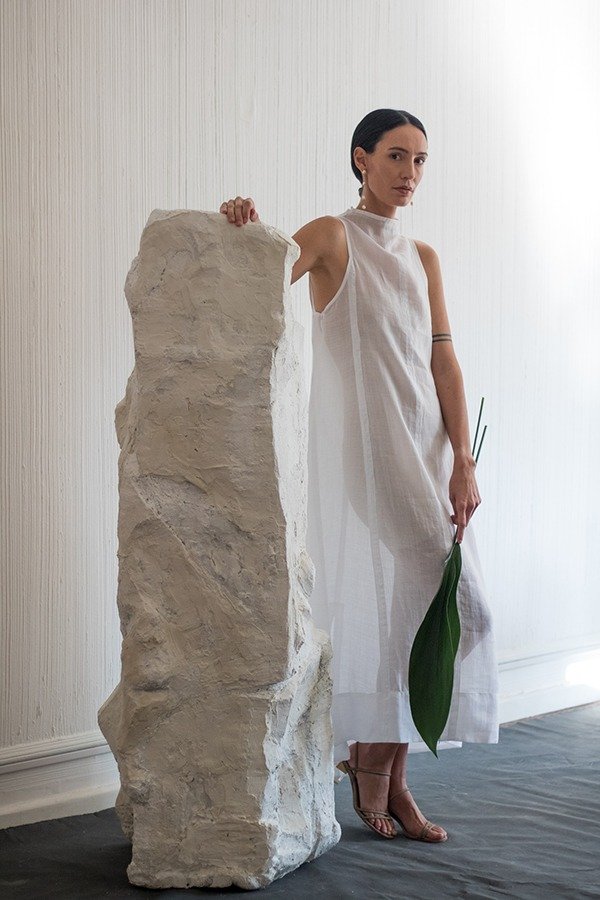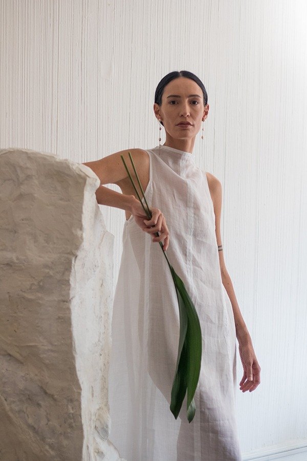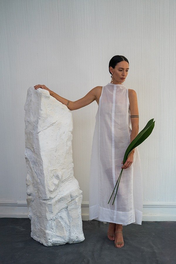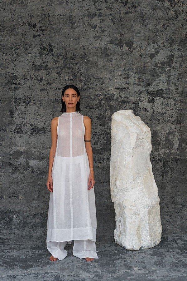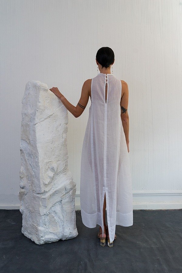 El Vestido Esteño se encuentra confeccionado en 100% ramio. Con escote cerrado que sube hasta el cuello, sin mangas. Con recortes en el frente para lograr un mejor calce en busto, y generar una silueta recta y relajada. La espalda tiene detalle de abertura que se cierra con botones de nácar, y un tajo inferior con terminación en picos. El largo es al tobillo.